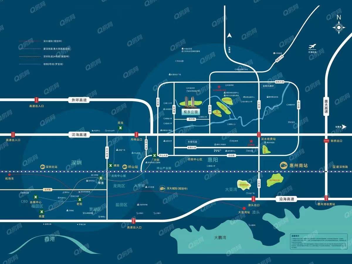 本案憑借地鐵、高鐵、高速口等交通便捷利好,享受港深惠三城一小時國際繁華生活圈,速抵達深圳北商務中心,福田CBD,一小時香港西九龍,享受同城便捷生活。