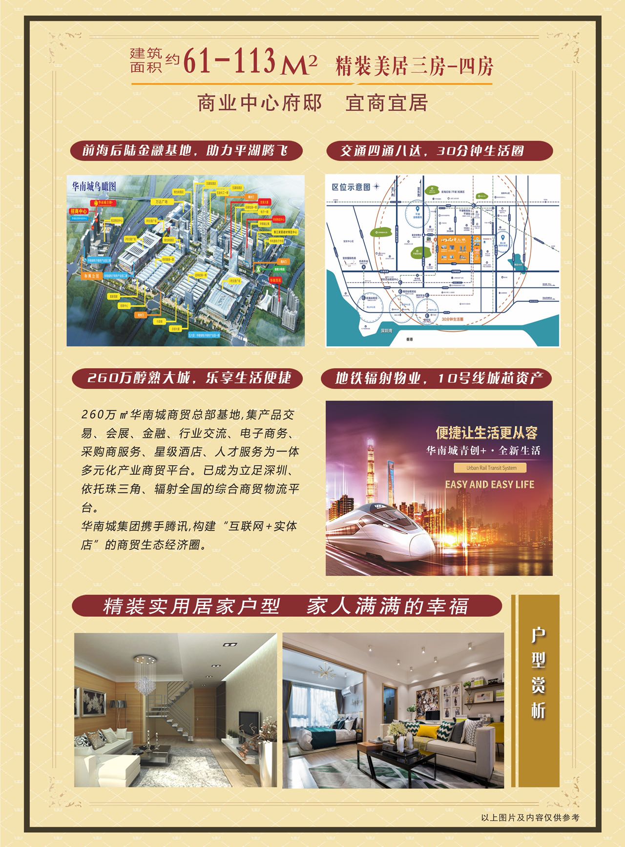 —— 華南城·青創(chuàng)+——首付50萬起 樂享精裝三居室精裝準(zhǔn)現(xiàn)房:16280 ㎡起面積:61-65-67㎡ 精裝2-3房78-113㎡ LOFT 精裝四房華南城26