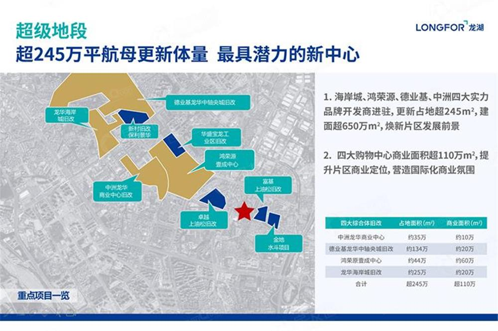 粵港澳大灣區(qū)中軸,深圳地理中心,龍華中心地段。政府約2000億元投資,近2.5倍福田中心區(qū)規(guī)模,超60個(gè)標(biāo)志性重大項(xiàng)目,打造集高端商務(wù)、現(xiàn)代商貿(mào)、金融服務(wù)于一體的國際會(huì)客廳。片區(qū)規(guī)劃更新面積超245萬㎡,建面超650萬㎡,中洲、海岸、德業(yè)基、鴻榮源四大購物中心超110萬㎡集中商業(yè)建面,周邊規(guī)劃綜合體林立,定鼎深圳未來最大商圈;